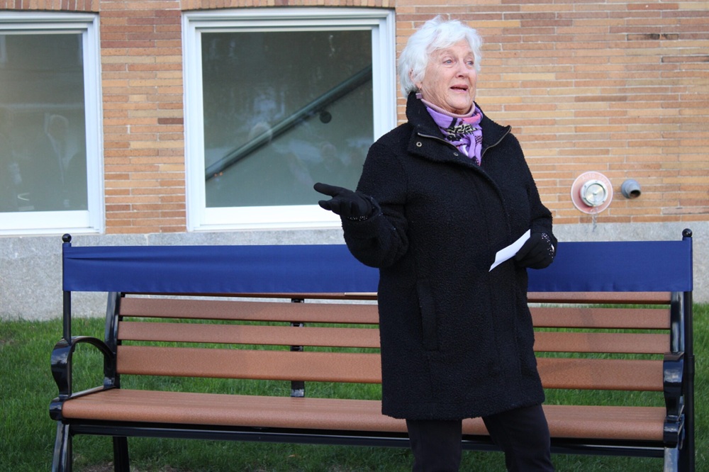 Chris Hoffmeister, daughter of Ralph Leader, speaks at the bench dedication. (Courtesy of Cameron Morsberger, Needham Local)