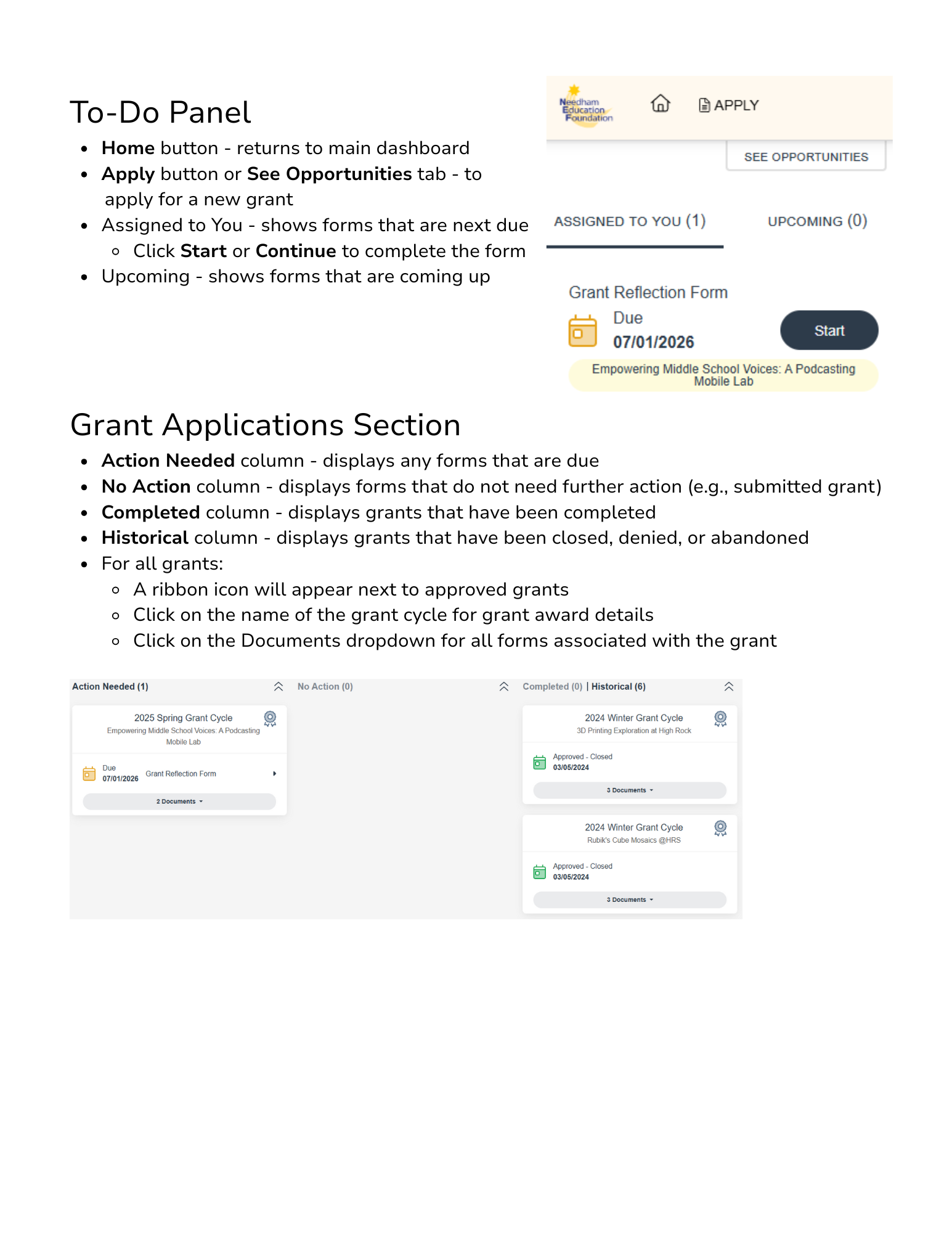 The applicant dashboard in the NEF’s grant system was updated in June 2025. See below for tips on navigating the system.