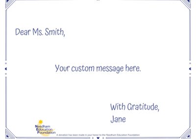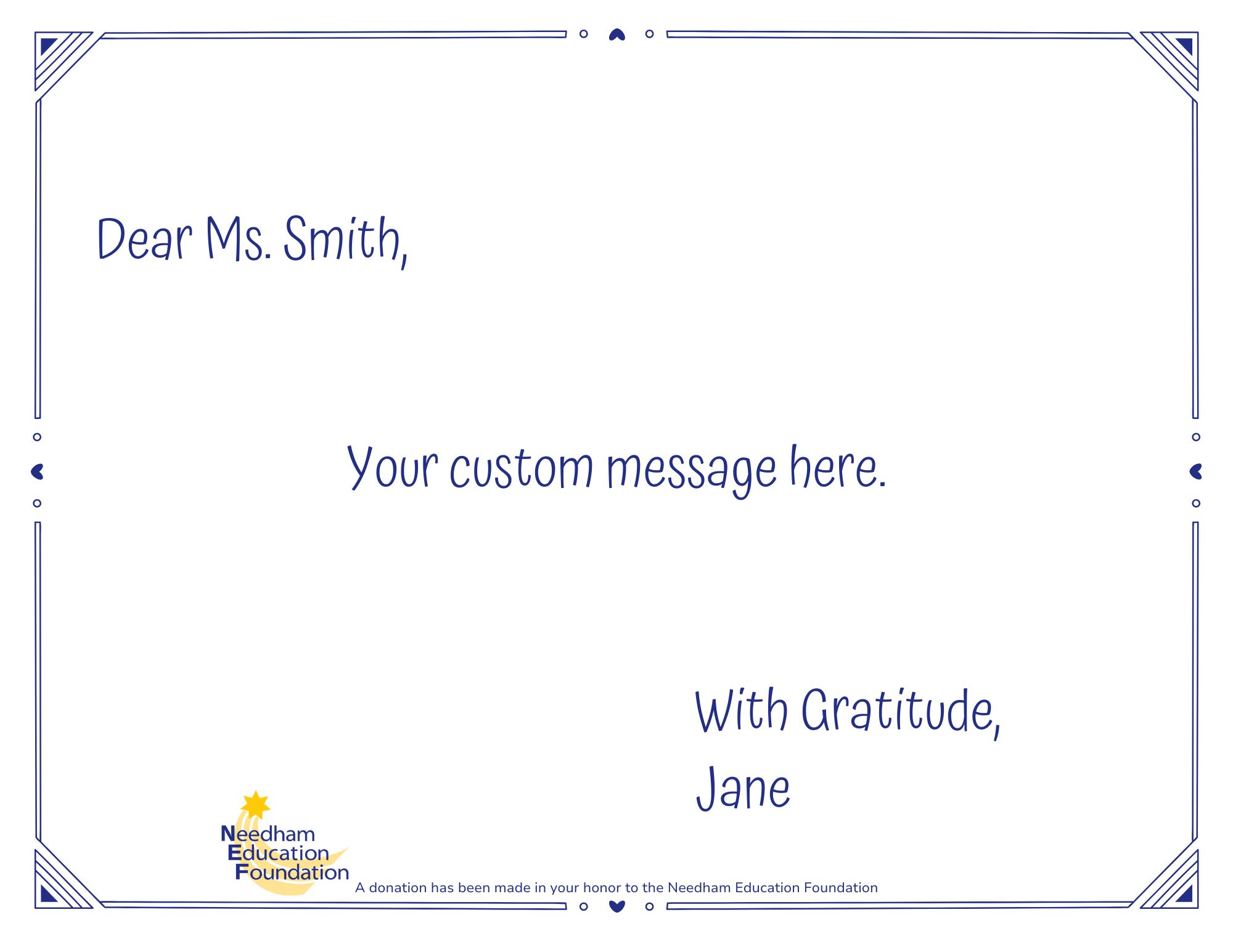 A donation to the Needham Education Foundation is a wonderful way to let teachers, staff, coaches, or anyone special in your child’s life know how much you appreciate them. By making a donation to the NEF in the name of a special person, you are showing them your gratitude while also providing vital support for the funding of innovative and engaging educational programs in the Needham Schools. Your gift helps make learning come alive!